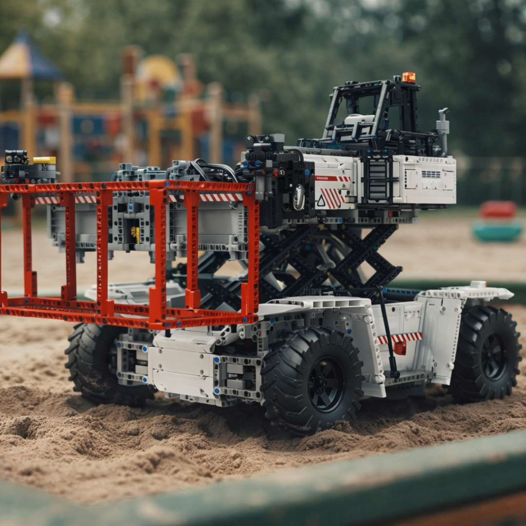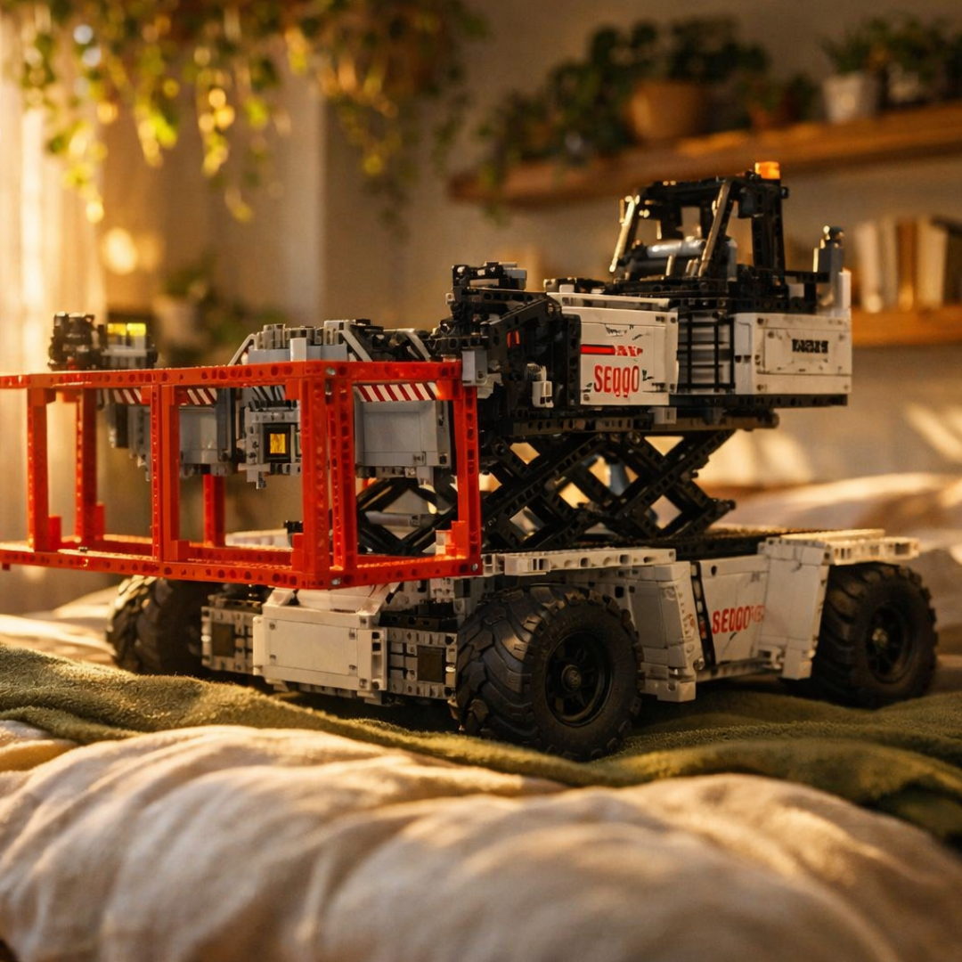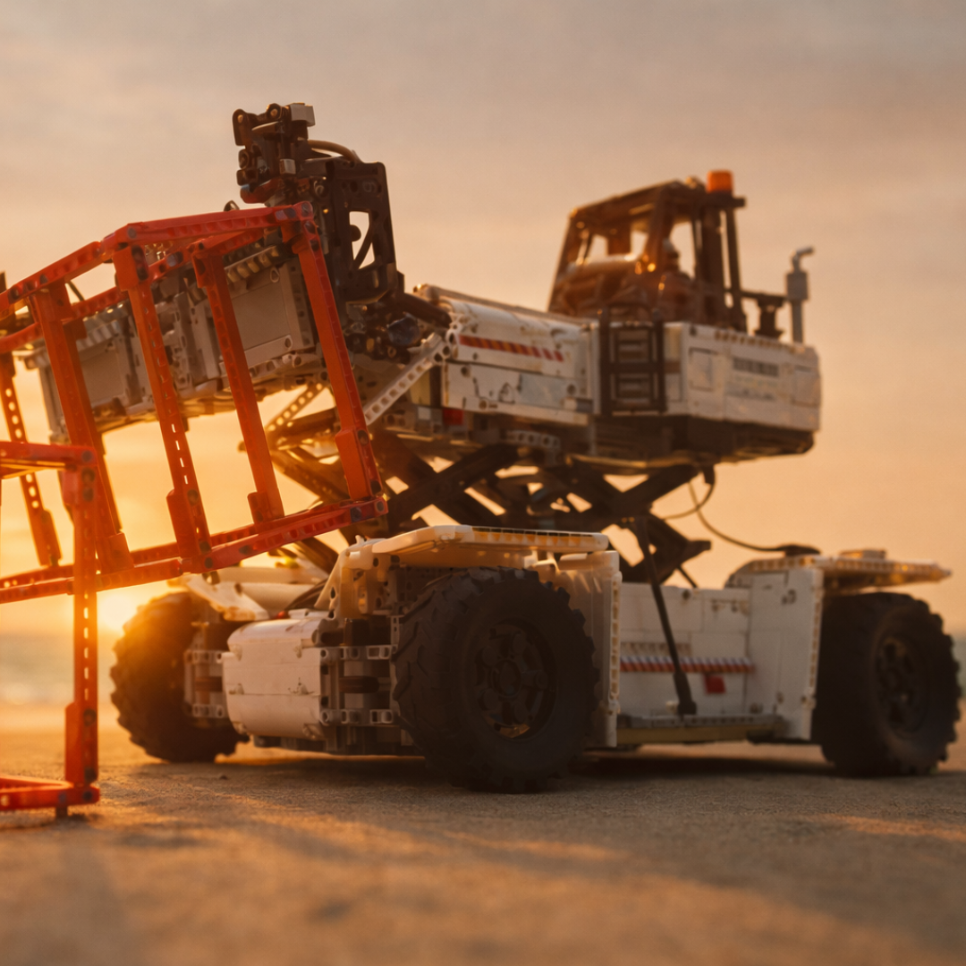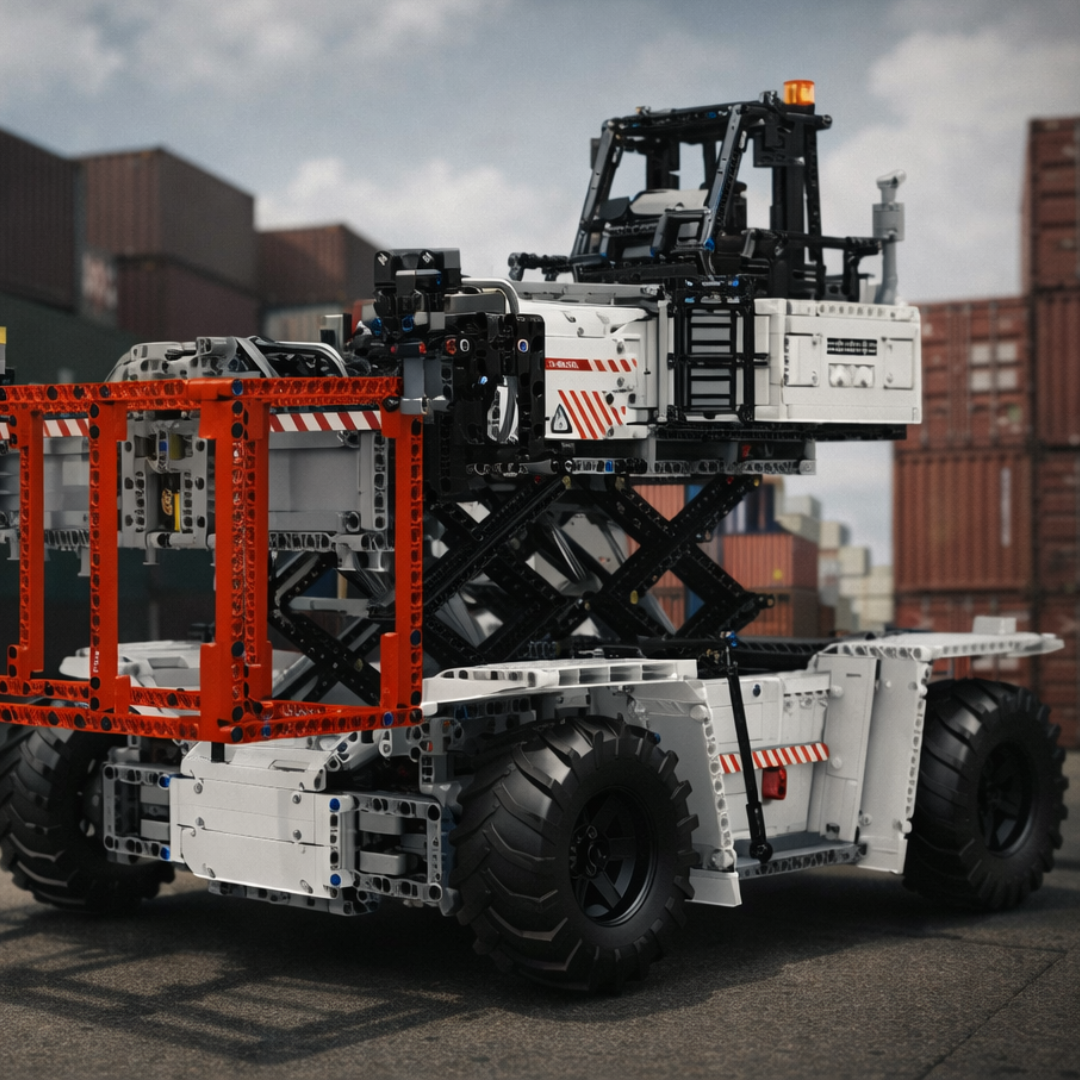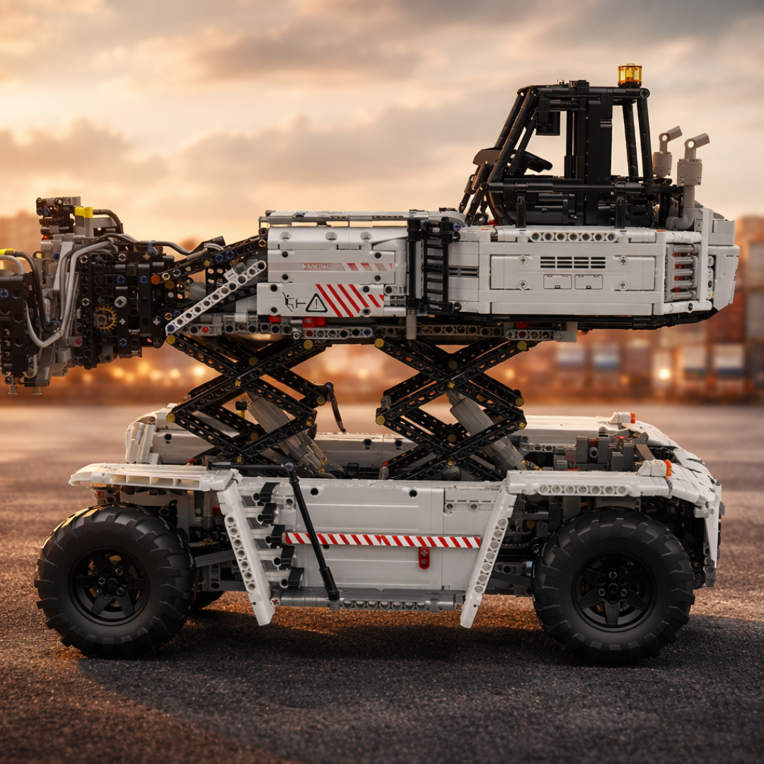 Jeśli posiadasz już Wózek widłowy półkowy (1 506 elementów) lub Wózek widłowy ciężki zdalnie sterowany (4 579 elementów), ten model uzupełnia kolekcję maszyn logistycznych, przekształcając każdą przestrzeń ekspozycyjną w działający przemysłowy plac.