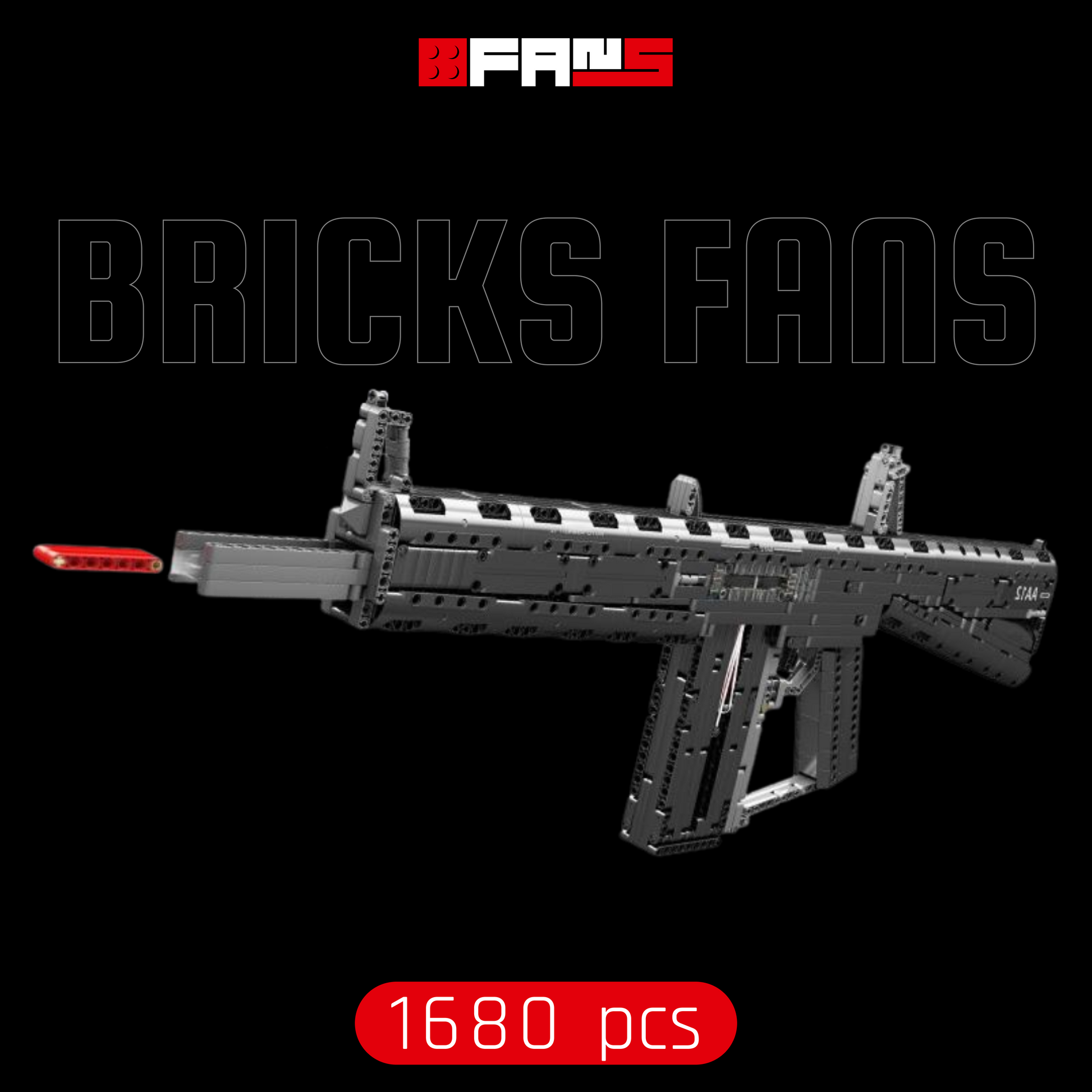 As you build, you notice how the pieces fit together in functional layers: first the structural base, then the internal rails, followed by the “aesthetic bolt” assembly, and finally the external shell: everything designed to simulate the logic of a tactical weapon’s internal mechanics.